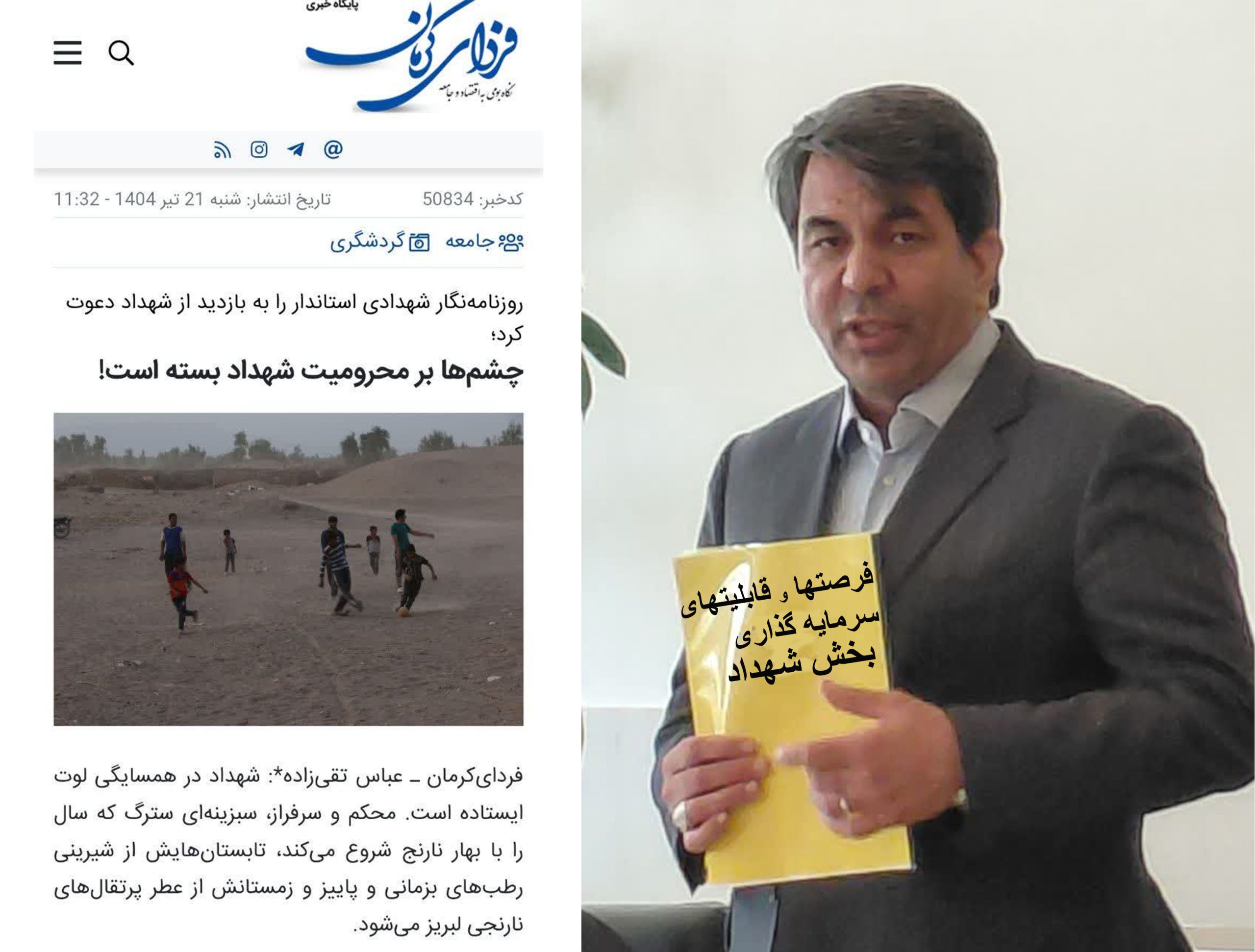 سوتک گلی به نقل از خبرگزاری فارس- خانم مهسا حقانیت: نامه‌ای از یک روزنامه‌نگار قدیمی اهل شهداد، «عباس تقی‌زاده» به محمدعلی طالبی استاندار کرمان موجب شد تا آقای استاندار در گرمای خرماپزان مردادماه به شهداد به‌عنوان یکی از گرم‌ترین نقاط کره زمین سفر کند. خبرگزاری فارس_کرمان: خورشیدِ مردادماه، خودش را از بالای کوه‌های صاحب‌الزمان (عج) … ادامه